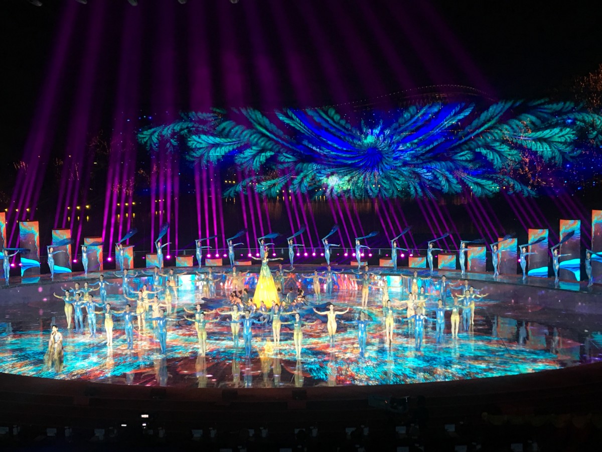 今晚的世园会妫汭剧场美轮美奂,从剧场舞台到环湖岸线,从近处的清杨洲到远处的中国馆、永宁阁,灯光霓虹一路绵延,一幅五彩斑斓的山水园艺画卷徐徐展开。